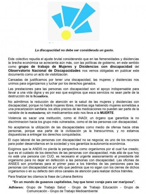 La discapacidad no debe ser considerada un gasto. Este colectivo repudia el ajuste brutal considerando que en las femeneidades y disidencias la brecha económica se acrecienta aún más, con las políticas de gobierno, en este sentido como grupo de trabajo de Mujeres y Disidencias con discapacidad del Observatorio Nacional de Discapacidades nos vemos obligadas en publicar este documento como un acto de visibilización.