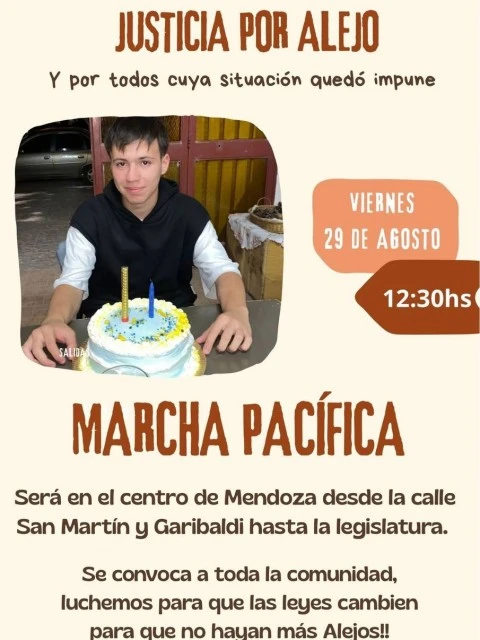 El próximo viernes 29 de agosto a las 12:30 hs, la familia de Alejo Montenegro convoca a una marcha pacífica en el centro de Mendoza. El recorrido partirá desde la intersección de calle San Martín y Garibaldi hasta la Legislatura Provincial. La consigna es clara: pedir justicia por Alejo y por todos aquellos cuya situación quedó impune.