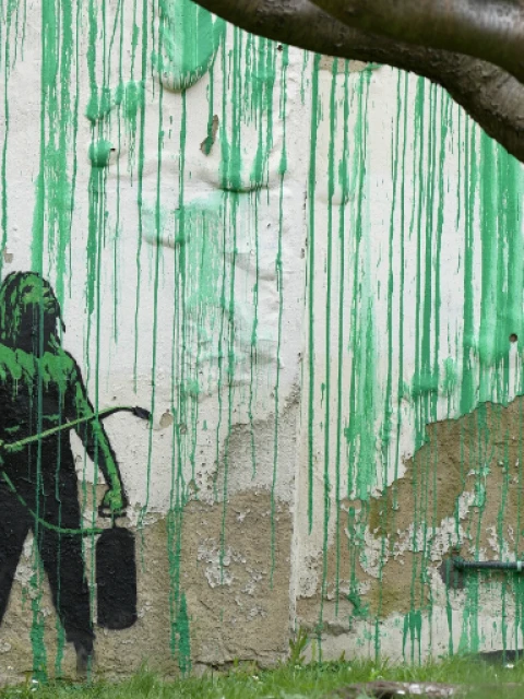 Banksy, que nunca ha confirmado su identidad completa, comenzó su carrera pintando edificios con aerosol en Bristol, Inglaterra, y se ha convertido en uno de los artistas más famosos del mundo. Sus imágenes traviesas y a menudo satíricas incluyen a dos policías besándose, policías antidisturbios armados con caras sonrientes amarillas y un chimpancé con un cartel con las palabras: "Ríete ahora, pero algún día estaré a cargo". El trabajo de Banksy se ha vendido por millones de dólares en subastas, y los murales anteriores en sitios al aire libre a menudo han sido robados o retirados por los propietarios de edificios poco después de ser creados.