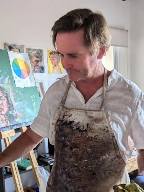 Charlie O'Malley pintando una de las obras de la exposición donde rinde homenaje a quienes dan vida a los vinos mendocinos.
