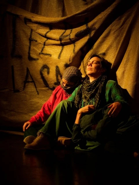 Una obra que propone un dispositivo para pensarse en lo político, una experiencia sin un "cuentito" cerrado, podríamos inscribirla en el teatro del absurdo. Te invitamos a deshacer, gastar, encender. Banderas en el desierto no es solo para ver sino para vivir, para usar. No la guarde solo en su memoria, no la entienda con la razón, sino con las entrañas. Derrote el miedo. Cante. Lo que la obra contiene se puede negar, inspirar, charlar, activar, cuestionar, incendiar, abrir, pero no desaparecer.