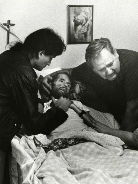 Therese se sentó en un extremo de la habitación y realizó unas pocas tomas, sin saber el destino final de esas imágenes, Kirby, de solo 32 años, murió abrazado por su padre, segundos después de su última foto. Cuando las reveló quedo devastada, la imagen de Kirby se parecía demasiado a la de Jesucristo y la proximidad con la muerte estaba reflejada como en muy pocas imágenes de la historia.