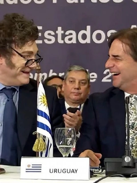 "Todo lo que sea para romper, me encanta", dijo el presidente Javier Milei al recibir el martillo protocolar de las sesiones del bloque de su par saliente de Uruguay, Luis Lacalle Pou.