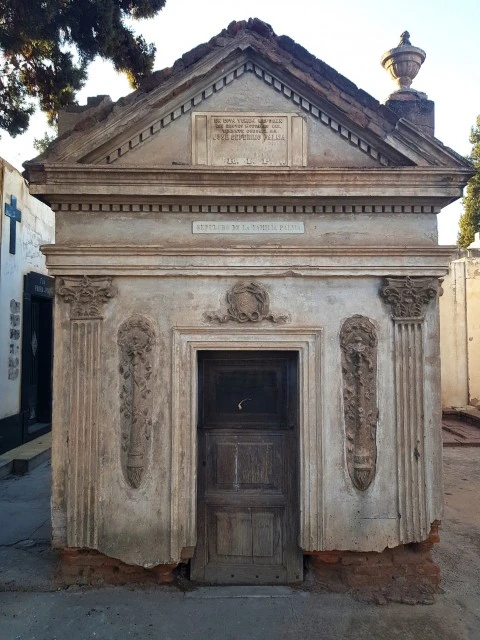 Una vez más, junto a Diario PORTADA, nos aventuramos por la avenida principal del Cementerio de la Ciudad de Mendoza. Es tarde, viento Zonda, como si él trajera memorias de otros tiempos, mientras el sol se filtra entre las sombras de los cipreses, y el trinar persistente de los pájaros parece custodiar secretos antiguos, que nos obliga a detenemos frente a un sepulcro centenario. Su estructura, de cemento alisado, aún resiste con entereza el paso del tiempo. Lo corona un frontón triangular que, con sobria solemnidad, anuncia: "Sepulcro de la familia Palma".