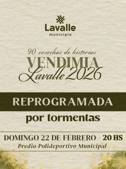 La Municipalidad de Lavalle comunicó que, debido a las inclemencias del tiempo, la fiesta departamental de la Vendimia se llevará a cabo el 22 de febrero, a las 20.00 hs, en el Predio verde del Polideportivo Municipal.