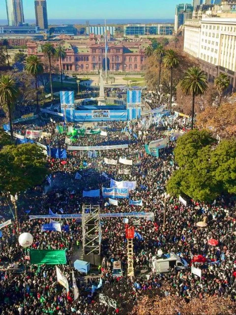"les mando un abrazo enorme a esa plaza maravillosa, desbordada, que me hace acordar a la del 9 de diciembre de 2015. Gracias por estar codo a codo, fuerza compatriotas, los quiero con todo mi corazón. Como siempre, con firmeza, con mucho trabajo y con amor profundo por esta patria. Fuerza compañeros, fuerza argentinos".