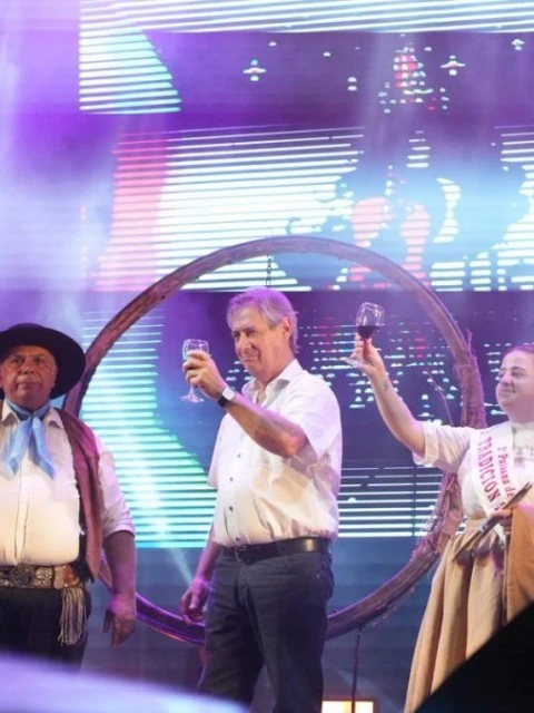 Para el cierre, el intendente Omar Félix, junto al titular de la Federación Gaucha, Walter Riesco, y la Segunda Paisana Provincial de la Tradición, Flavia Jodar, subieron al escenario para realizar el tradicional golpe de reja y brindar con el vino nuevo, símbolo de esperanza y trabajo compartido.