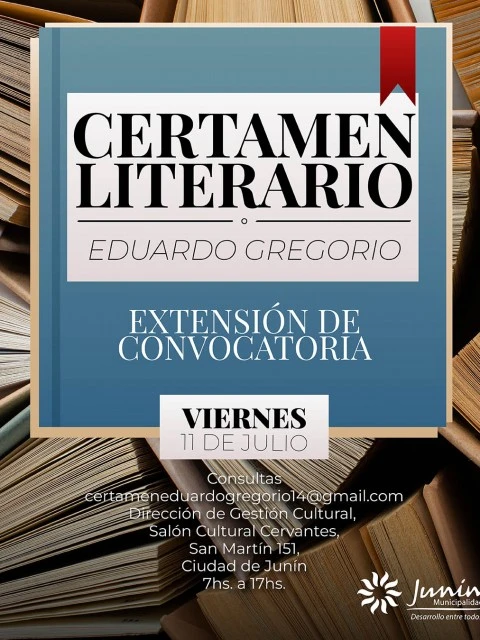 La Municipalidad de Junín, a través de la Dirección de Gestión Cultural, informa que se prorroga el plazo de presentación de obras para la XIV edición del Certamen Literario Provincial Eduardo Gregorio. Los cuentos podrán enviarse hasta el viernes 11 de julio, a las 23.59 horas, exclusivamente al correo electrónico: certameneduardogregorio14@gmail.com