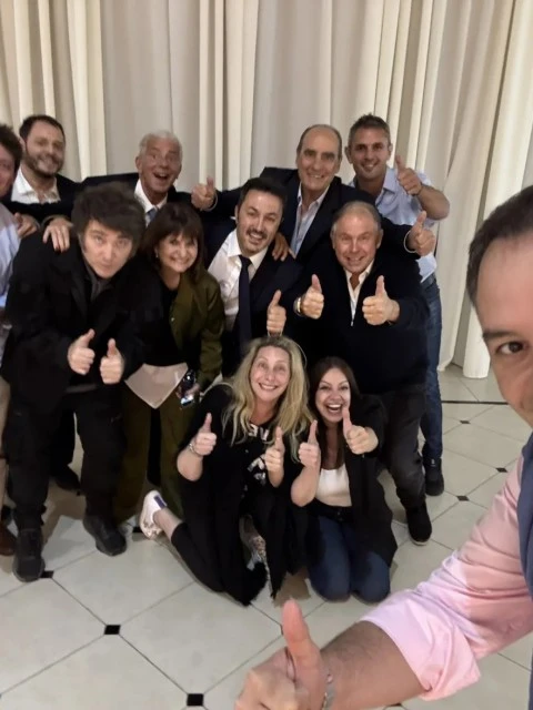 Al término, inmortalizaron el particular intercambio con una selfie que tomó el vocero presidencial, Manuel Adorni, y que tiene a los funcionarios imitando el particular gesto del libertario, con los dedos pulgares levantados: