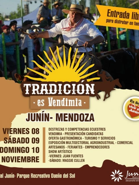 La Municipalidad de Junín presenta "Tradición es Vendimia", un encuentro único que se celebrará del viernes 8 al domingo 10 de noviembre en el Predio Rural Junín, ubicado en el Parque Recreativo Dueño del Sol. Durante tres días, los visitantes podrán disfrutar de eventos que combinan lo mejor de la tradición, la vendimia, el arte, la gastronomía y la tecnología.