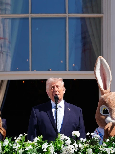 Donald Trump y Melania Trump acompañados de un conejo de Pascua disfrazado.
