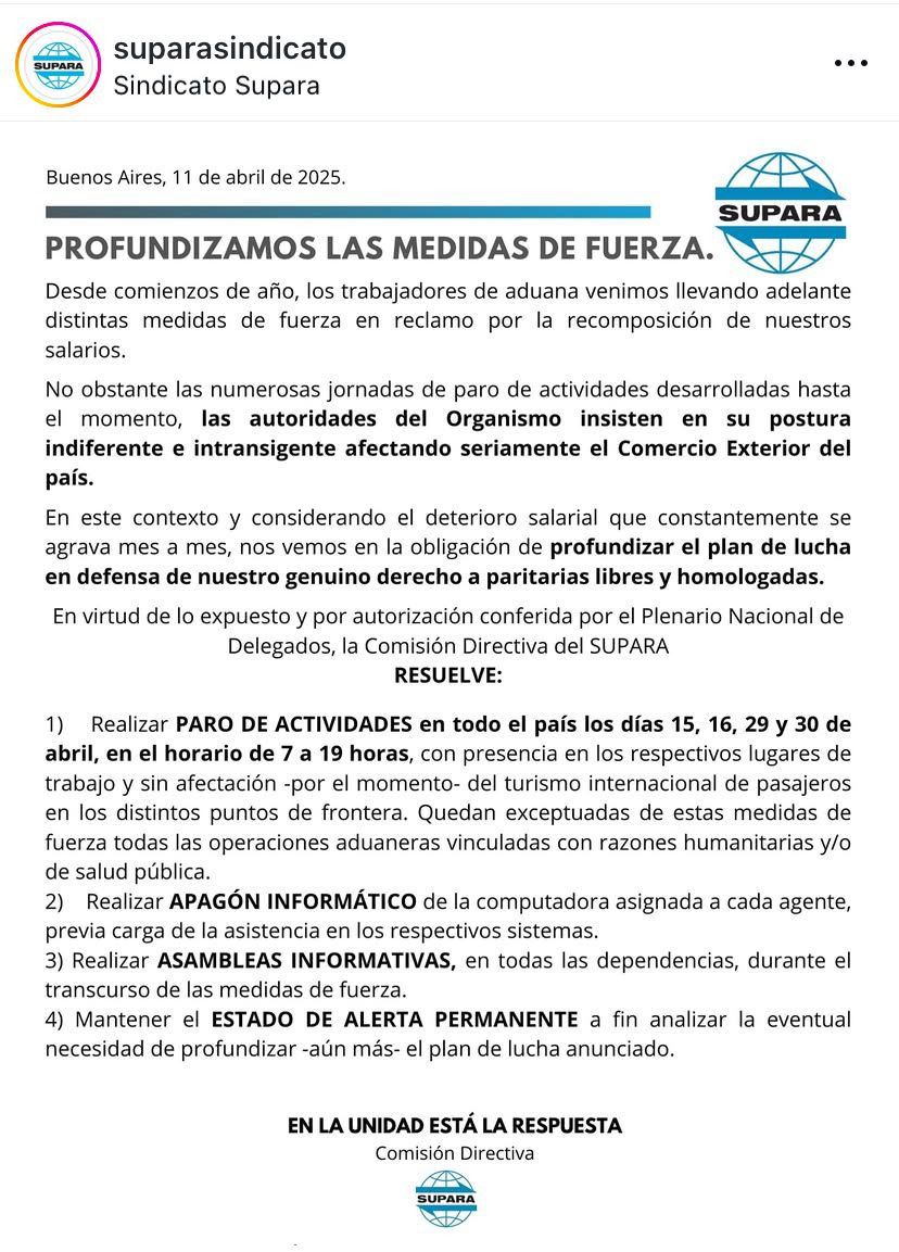 SUPARA, Sindicato Único del Personal Aduanero de la República Argentina profundiza la medida de fuerza prevista para esta Semana Santa y afectará seriamente el cruce fronterizo hacia Chile. El paro de actividades está previsto para todo el país e incluirá las siguientes medidas: