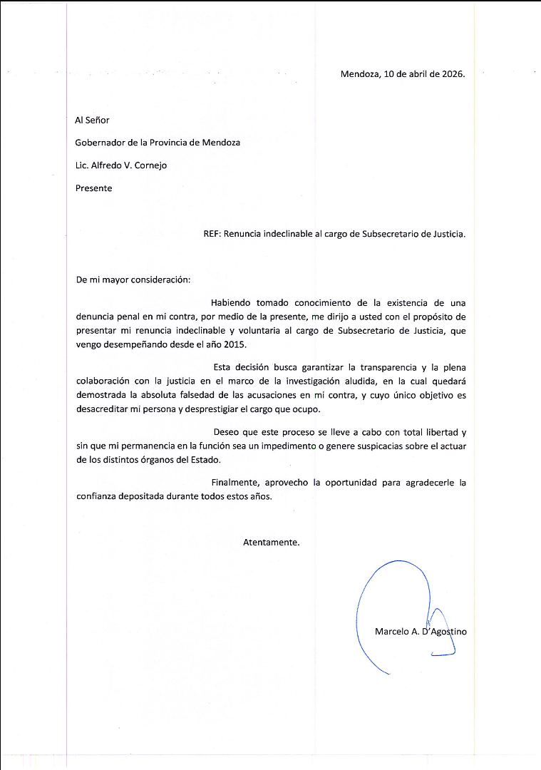 El exsubsecretario de Justicia de Mendoza, Marcelo D'Agostino, presentó su renuncia luego de ser denunciado por abuso sexual y otros delitos vinculados a violencia de género. La dimisión fue aceptada por el gobernador Alfredo Cornejo, en un contexto de fuerte repercusión institucional.